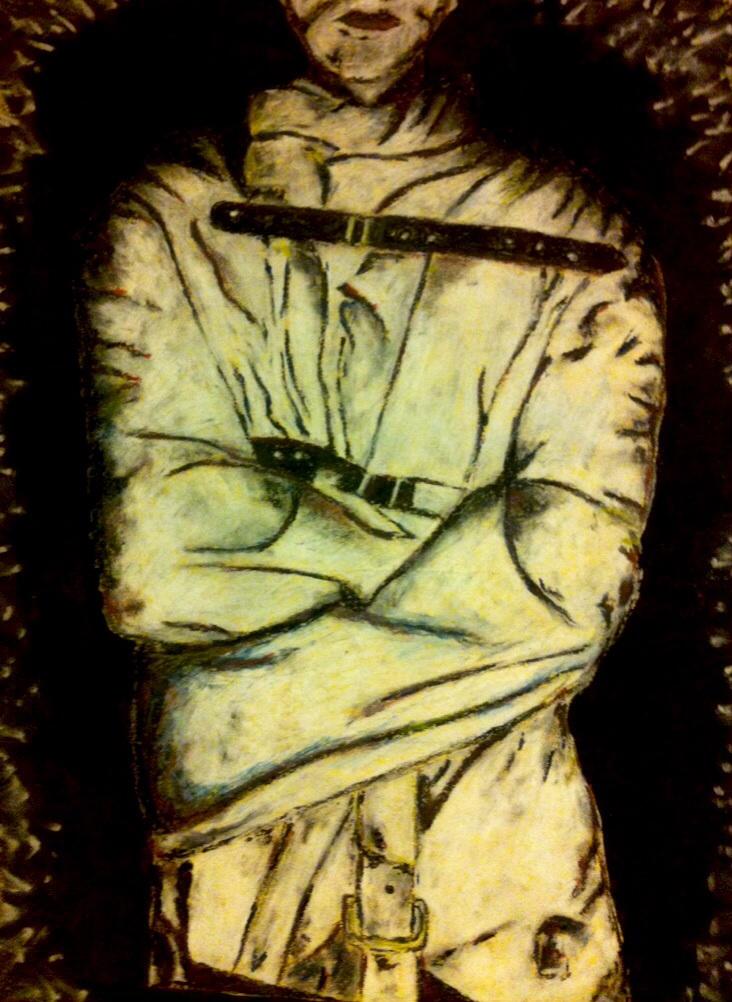 Copia da fotografia. Progetto scolastico sulla follia umana. Pastello a olio acrilico e matita colorata. Paura