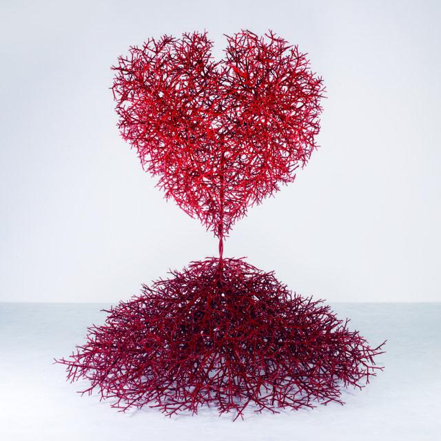 L’amore ramifica è una scultura “arteriosa” in tondini di ferro di colore rosso a sezione crescente che simboleggia un cuore, o meglio la classica forma folkloristica utilizzata per raffigurare il senso