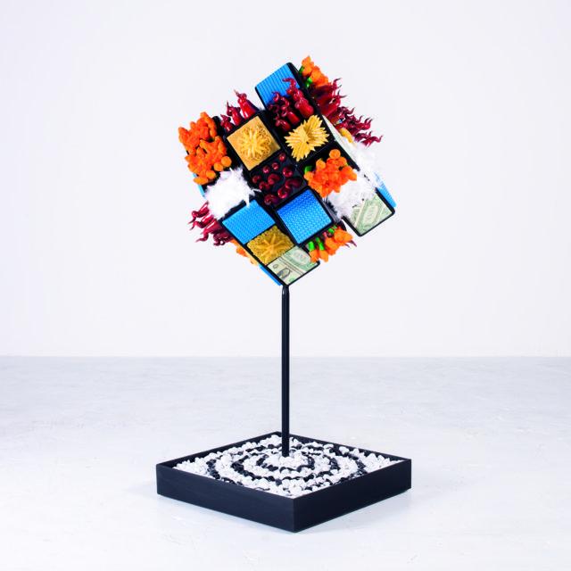 Quest’opera incarna, attraverso le forme e i colori del famoso cubo di Rubik, alcuni dei tanti fattori che insistono nella vita di una persona per garantirne un’esistenza serena. La concatenazione dei sei colori del “cubo magico”, rappresenta, in un certo senso, la simultaneità degli elementi che contraddistinguono la vita. La ricchezza, la saggezza, la fortuna, il gusto, le leggerezza e il tenersi giovani, ad esempio, sono solo alcuni dei tanti fattori che quotidianamente ci troviamo a vivere, anche inconsciamente. L’errore più grande è pensare che tali elementi, essendo molto diversi tra loro, non abbiano alcun tipo di legame. L’opera, con un semplice colpo d’occhio, vuole dimostrare proprio questo, come i fattori, che caratterizzano la vita, siano strettamente concatenati da un’unica risultante comune.