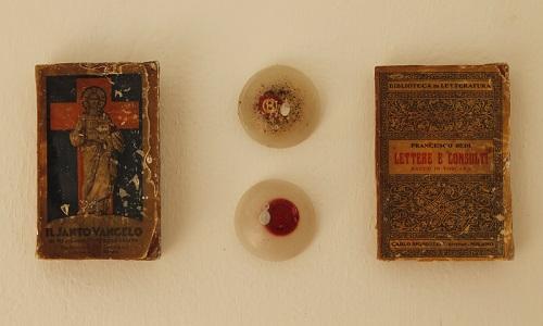 Paraffina, caffè, fili, stoffa, medagliette raffiguranti la Vergine Maria, Libri