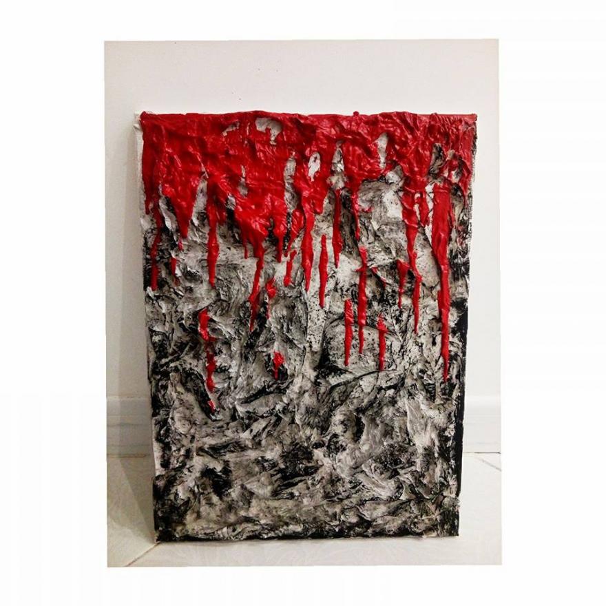 Fondo di carta assorbente mista a colla vinilica,con pennellate di colore ad olio nero e colata di acrilico rosso.