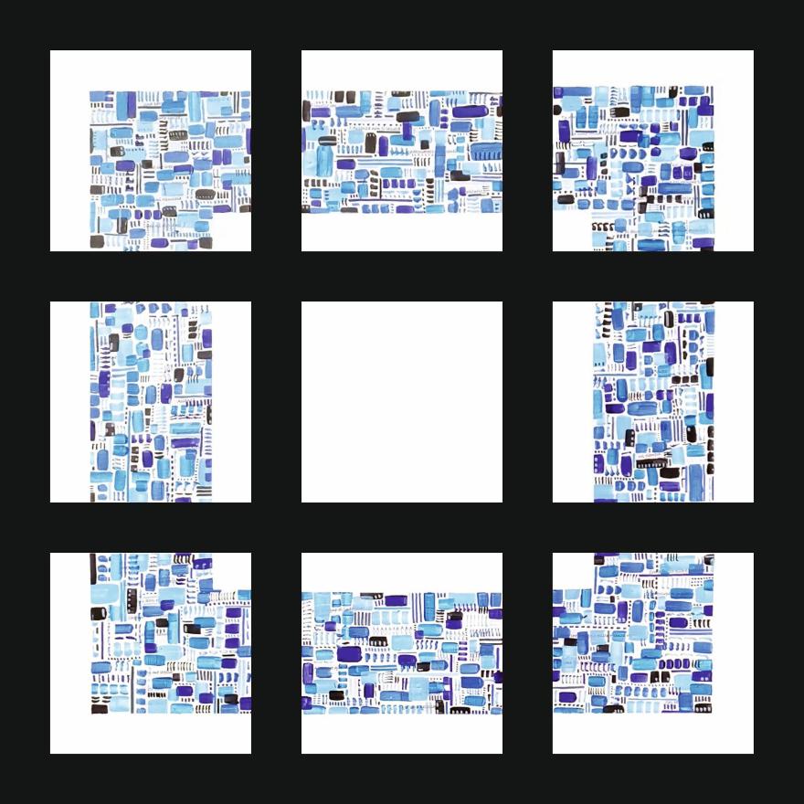 Assenze è un’opera modulare unica e di grandi dimensioni (60 x 60 cm), meticolosamente assemblata a partire da nove tele individuali (20 x 20 cm ciascuna). Il motivo decorativo, sviluppato su tonalità di blu, acquisisce piena coerenza solo quando le unità sono disposte con precisione, articolando visivamente la frammentazione del sé.