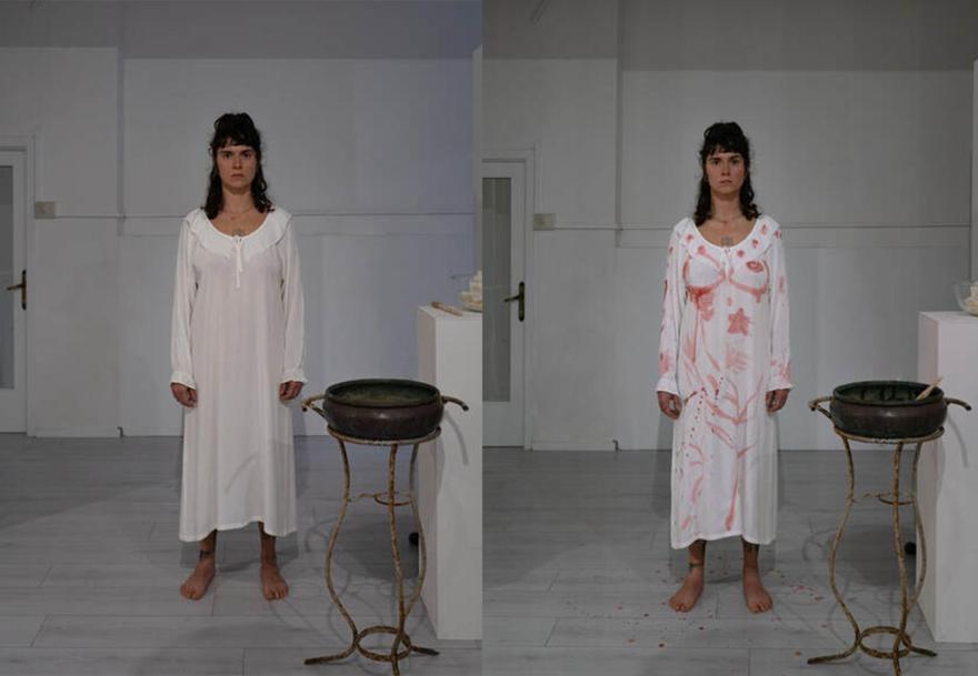 performance 2025 Montecassiano, Italia Ciò che resta Riflessione sulla performance Metamorfosi silenziosa della mostra “L’abitudine di cadere, discorso sulle donne” curata da Michele Gentili. Piazza McZee, Montecassiano, 15-03-2025. In Italia, nel solo 2024, sono state uccise 98 donne. Più di 12.000 sono state vittime di maltrattamenti familiari, oltre 8.500 hanno subito stalking e quasi 3.000 hanno denunciato violenze sessuali. Questi numeri, sebbene già drammatici, sono solo la punta di un iceberg molto più profondo. Ogni giorno migliaia di donne subiscono violenza fisica, psicologica, economica e simbolica. Una violenza spesso taciuta, normalizzata, giustificata. Alla base di questi numeri c’è una disparità strutturale che attraversa ogni aspetto della vita: lavorativo, economico, sociale, relazionale. Le donne in Italia lavorano meno, guadagnano meno, hanno carriere più fragili, ruoli di cura non retribuiti e meno accesso ai ruoli di potere. Non è una semplice questione di “pari opportunità mancate”: è un impianto culturale ancora profondamente patriarcale che produce disparità, che tollera la violenza, che relega il corpo femminile a uno spazio pubblico da giudicare, modificare, consumare. In questo contesto si inserisce la mia performance. Un’azione che trae ispirazione anche da grandi lavori del Novecento come “Cut Piece” di Yoko Ono e “Rhythm 0” di Marina Abramović. Come loro, mi sono offerta al pubblico. Vestita solo di una camicia da notte bianca, sono rimasta in piedi nella galleria per due ore. Accanto a me, un catino di rame contenente un liquido rosso simbolo di sangue, sacrificio, esposizione. Il pubblico poteva, liberamente, utilizzare quel liquido per segnare il mio corpo o la mia veste. Nessun* era obbligat*. Nessun* era legittimat*. Eppure, molt* hanno partecipato. Hanno agito. Hanno toccato. Qualcun* ha carezzato. Qualcun* ha stretto i miei polsi. Qualcun* ha decorato il mio corpo usando la zampa del proprio cane. Qualcun* ha spinto una bambina a partecipare, imponendole un gesto che non le apparteneva. Ho accolto ogni azione senza reagire, senza difendermi. Il mio silenzio è stato letto come assenso. La mia immobilità come disponibilità. Il mio corpo, come quello di troppe donne ogni giorno, è diventato spazio pubblico. Espropriato. Violato. Il bianco della camicia, inizialmente intatto, si è trasformato in un campo di segni. Quel vestito, ora sporco, racconta. Parla di libertà fraintesa. Di dominio mascherato da gioco. Di invasione dissimulata da partecipazione. Questa performance non nasce come provocazione ma come specchio. Ogni gesto compiuto su di me è un riflesso. Ogni traccia lasciata è testimonianza di quanto siamo ancora lontan* dal rispetto. Non solo dal rispetto di genere, ma dal rispetto dell’altr* in quanto altr*. Viviamo in una società individualista, competitiva, filtrata dal desiderio di possesso e consumo. Una società che ci ha diseducat* alla cura, alla reciprocità, alla soglia. Una società che scambia la libertà per diritto di invasione. E quando il consenso viene ignorato, l’altr* diventa oggetto. Quando il limite viene oltrepassato, non resta che la traccia dell’abuso. Questa veste macchiata è ciò che resta. Un corpo segnato, un confine superato, una domanda aperta. Siamo pronti a guardare ciò che abbiamo fatto?