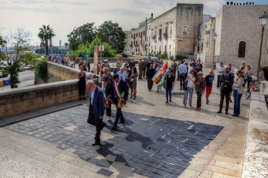 Il 9 Settembre 1943 il giovane Michele Romito fu simbolo della resistenza barese sventando l’ingresso nel Borgo Antico dell’esercito nazista; in occasione del 76’ anniversario della liberazione di Bari e per ricordare i cittadini che difesero la Città, il 9 Settembre 2019, in collaborazione con Arci Bari, è stata presentata l’installazione “Solo Nero” di Angela Capotorto curata da Fabio Caccuri. Lo spazio che ha accolto il lavoro dell’artista è proprio la parte di Via Venezia, al di sopra dell’arco di Largo Papa Urbano II, da dove Romito lanciò due bombe per contrastare l’avanzata delle truppe tedesche. Il tratto di Muraglia ha accolto un tappeto nero posto in corrispondenza dell’arco sul quale i fruitori sono stati costretti a camminare, nell’attraversare il tappeto i pezzi della carta nera che lo compongono si sono attaccati sotto le suole dei passanti. Ai margini dell’installazione, su entrambi i lati, sono stati posti dei contenitori neri nei quali è stato possibile liberarsi della carta nera incollata. Il gesto del calpestare diventa simbolo di come i cittadini baresi difesero la città dai nazisti ma al contempo attualizza anche una continua lotta per la liberazione e la necessità di essere sempre personalmente coinvolti in questo processo collettivo. Camminando sulla superficie, come metafora di un percorso, è inevitabile che una parte del nero si attacchi a noi, anche al di là della nostra volontà; tuttavia l’artista ci fa riflettere su come sia sempre possibile liberarsene.