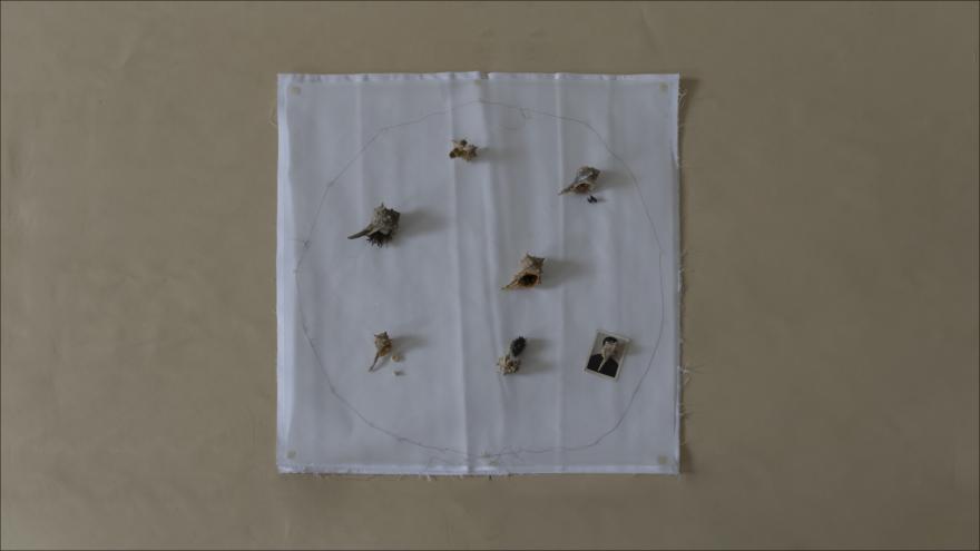 Capelli, conchiglie, oggetti personali, piante, cotone, carta lucida.