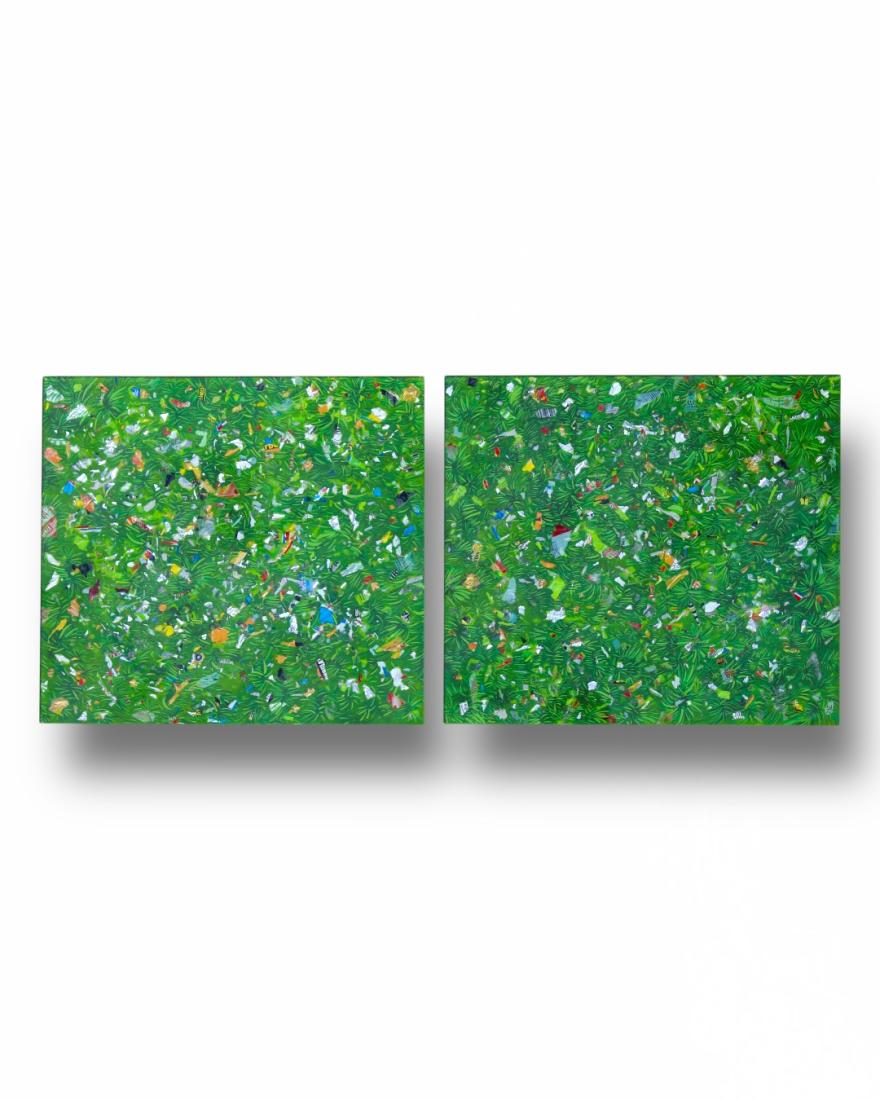 Dittico 51X112 cm, dipinto su vetro con frammenti di plastica racolti a terra durante le mie passeggiate in montagna. Suolo Effimero riflette sulla contraddizione del progresso umano: la capacità di ottenere tutto e subito, grazie a materiali sempre più avanzati, senza considerarne le conseguenze. Creiamo oggetti destinati a durare per sempre, ma li trattiamo come effimeri. L’opera prende forma attraverso un processo di raccolta e trasformazione. Frammenti anonimi di consumo sfrenato, prelevati direttamente dal suolo, vengono triturati e inglobati nella superficie pittorica, diventando una presenza irreversibile. Tracce silenziose di un sistema che produce e scarta senza sosta. Il dittico richiama le mattonelle da giardino, ma al posto di due lastre di cemento, emergono due porzioni di prato. Non è un prato fiorito, però: è un tappeto di microplastiche, mimetizzate ma onnipresenti. Dipinto su vetro al contrario e sospeso dalla parete, il lavoro riflette e deforma la realtà, evocando la fragilità di un ecosistema sempre più compromesso.