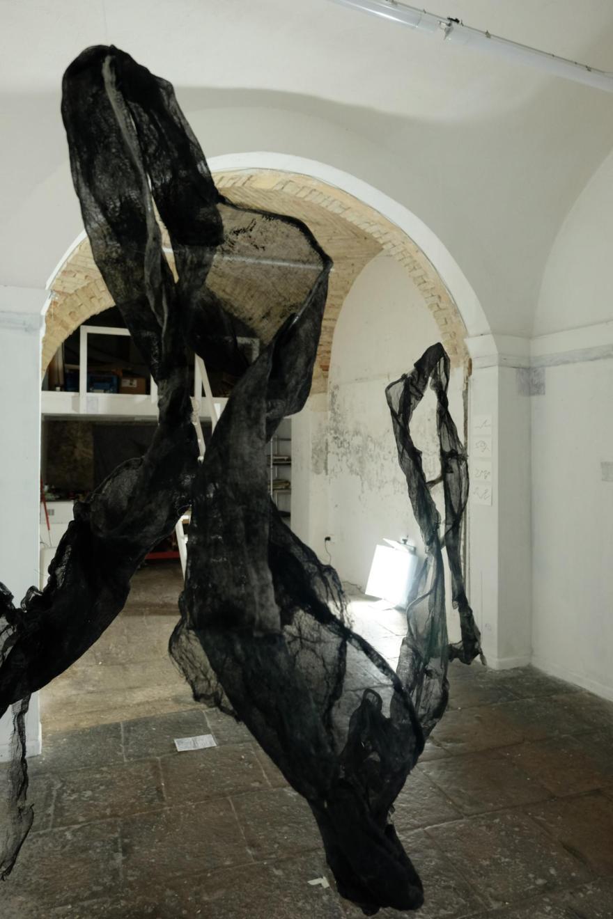 Ragionando in questa prospettiva il lavoro ricontestualizza questo gesto in una chiave installativa di grandi dimensioni che invade lo spazio espositivo. Il rimando simbolico a questa dimensione grafica è dato dalla tarlatana di recupero (materiale di scarto dell’incisione calcografica) cucita e modellata su una struttura in filo di ferro.
