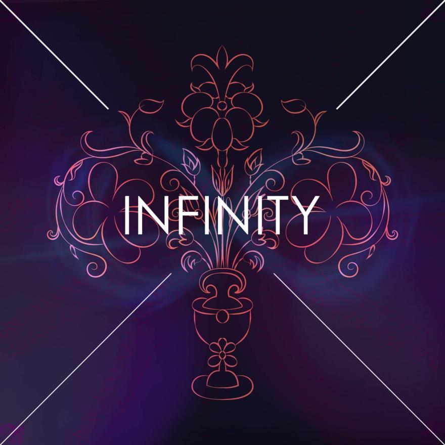 Al centro della composizione, quasi a interrompere e insieme a unire il flusso decorativo, compare la parola “INFINITY”: essenziale, bianca, moderna. La sua presenza segna il punto d’incontro fra linguaggio visivo e linguaggio scritto, fra la razionalità del segno tipografico e la vitalità organica del disegno. Quattro linee diagonali sottili incorniciano la scena, suggerendo una tensione verso l’esterno che impedisce alla composizione di chiudersi su sé stessa.
