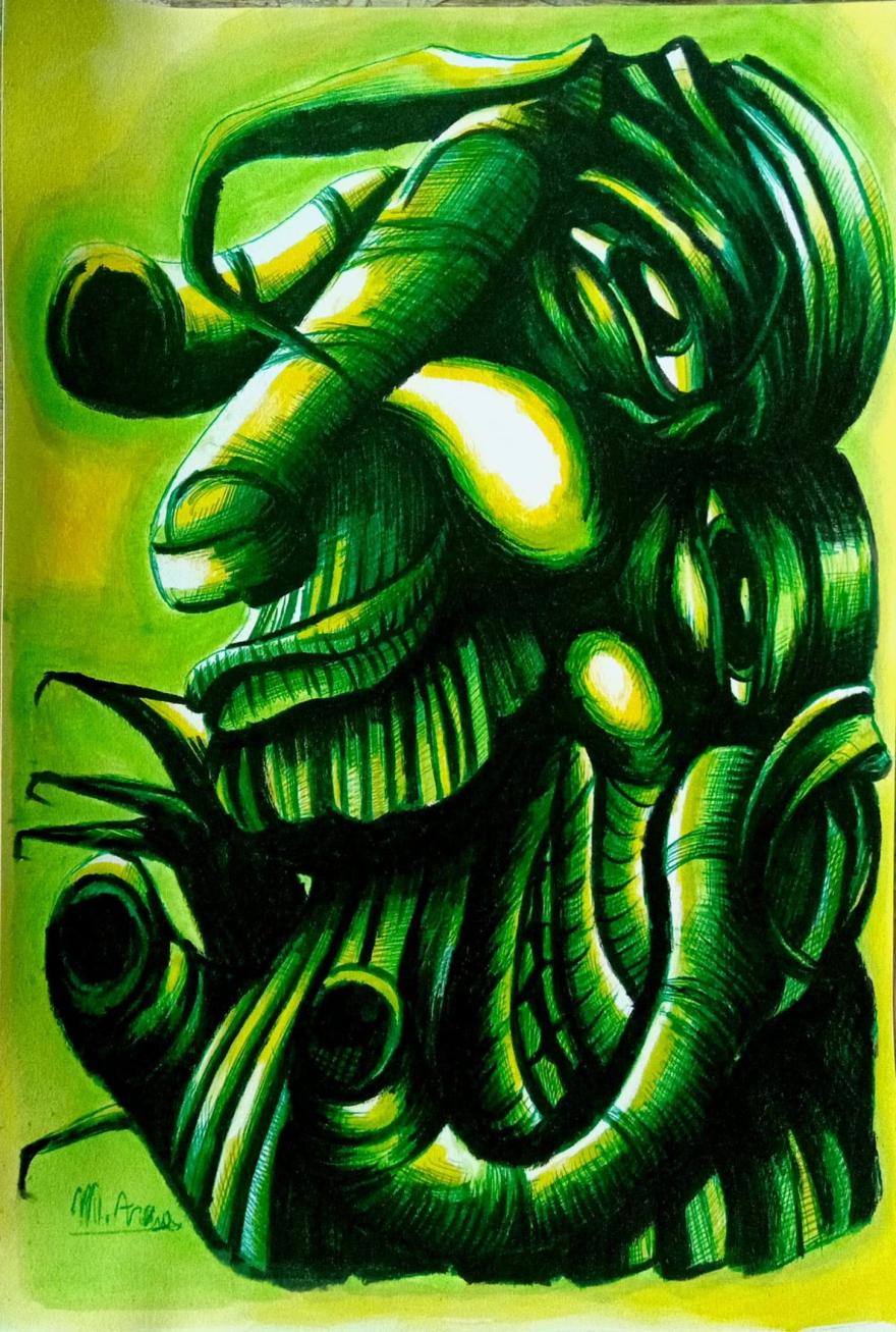 Omaggio all'arte outsider di Giovanni Cammarata e Mariano Pietrini. In quest'opera ho fuso i loro stili e i loro soggetti attraverso diverse gradazioni di verde come simbolo di un unione simbolica alla Natura.