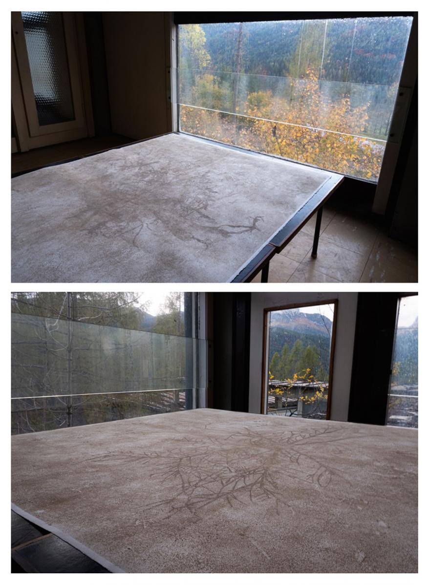 Cenere degli alberi sradicati da tempesta vaia su carta cotone, 2019 Carta cotone, cenere, vetro, binario in legno, morsetti. 160 x 104 cm