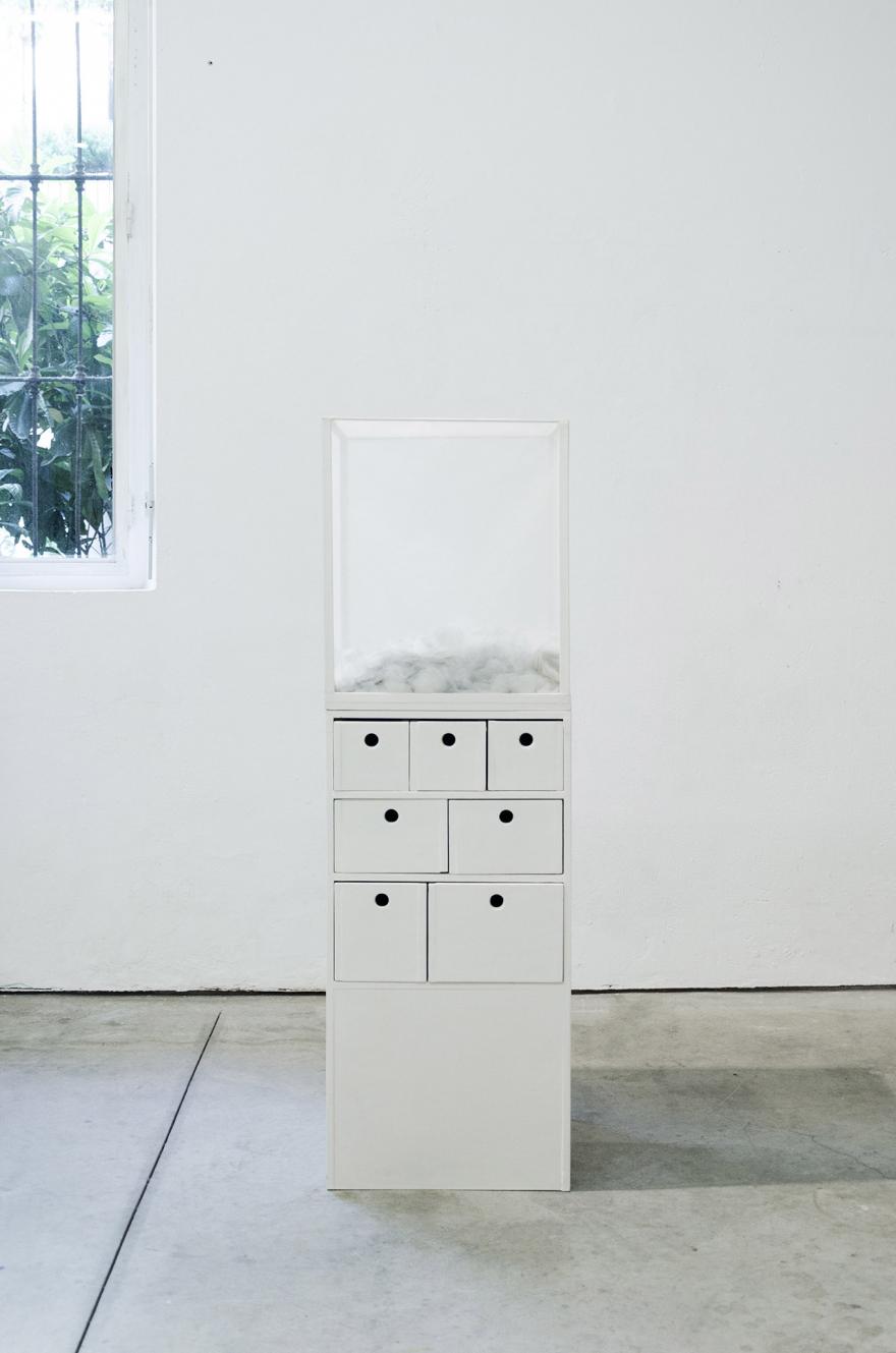 In Inversioni di Volo I, ho raccolto le giacenze di Milano, trovate nel suolo, e ciò che è volatile, invertendone simbolicamente il peso. Le giacenze, ovvero tutto ciò che gravita sul suolo, che vanno da oggetti, pietre, a pezzi di asfalto, in questo lavoro diventano leggere, quasi volatili. Ho raccolto il loro perimetro in fogli di carta da restauro, successivamente spezzettati in forma tondeggiante, e collocati nella parte più alta, dove generalmente si muovono solo le cose prive di peso o con capacità volatile. Ciò che è volatile della città, invece, è qui rappresentato dalle Polveri Sottili, ricavate raschiando le superfici di Milano, la sua pelle. Queste polveri diventano una giacenza e compongono una frase suddivisa in sette cassetti: