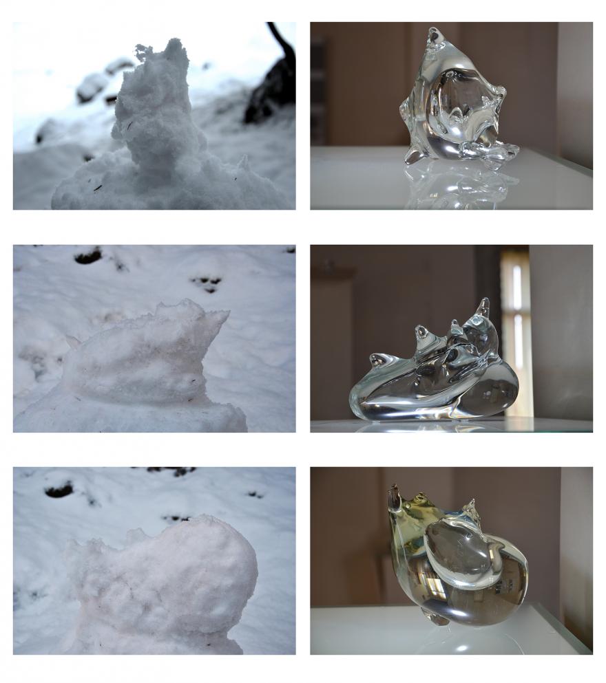 Neve verte sulla trasposizione di forme, da un materiale ad un altro, dalla neve al vetro, modellato e soffiato dai maestri vetrai di Murano.