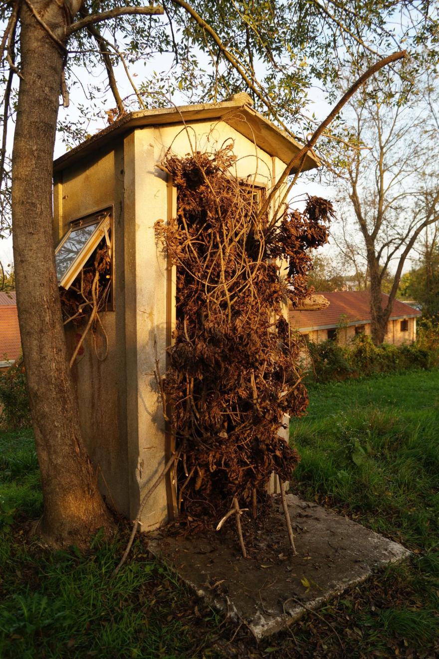 I rami seccati dal tempo si incastrano uno con l’altro all’interno di una guardiola abbandonata. Il rapporto dell’oggetto ritrovato cerca una connessione con il ter ritorio circostante. Una serie di opposti si combinano tra loro: il vuoto diventa pieno, la struttura artificiale si riempie di natura morta. Un rifugio per animali e insetti avviene attraverso questo inserimento di ele menti naturali in una sorta di nido. Colui che vuole entrare non ha più la possibilità di farlo se non attraverso la distru zione dell’opera o l’imme desimazione con i rami che si trovano al suo interno tornando quindi a sentirsi parte di una natura presente. Una serie di chiocciole trovate in loco sono state inserite dentro la struttura. Esse, come simbolo di elogio alla lentezza, all’affrettar si senza fretta ma senza tregua- come citava Goethe. Creature amanti dell’umidità e del buio.