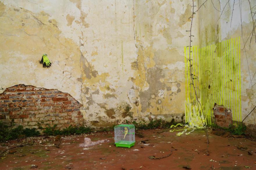 Il rito di liberazione di un uccellino di cocorita tenuto in gabbia avviene durante il giorno dei morti (1 novembre). Questo evento vuole proclamare l’attimo atteso, l’anima liberata e l’istante accaduto. Il sogno di un canarino in gabbia simboleggia la speranza nella completa prigionia, mentre l’uccello giallo libero diventa simbolo di un’anima che vola lontano da tutti riprendendo il colore del sole che sorge all’orizzonte, alba di un nuovo giorno. Il colore dipinto e ripetuto negli oggetti industriali riprende il giallo del piumaggio dell’animale. Artificiale e naturale, sogno e realtà si intrecciano tra di loro innescando una ripetizione in una medesima situazione. La libertà dell’istante si oppone alla gabbia del lavoro e del denaro ripreso da elementi quali guanti, bricchetta di un valore di 10.000 euro e gabbia in cui è temporalmente contenuto l’animale. Gelb (giallo in tedesco) e geld (denaro) diventano similitudine nell’installa zione presentata.