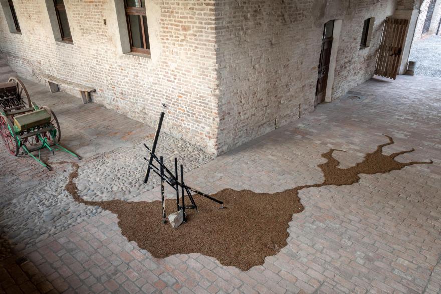 Stazione di rifornimento - ginnica (serie di stazioni di rifornimento interspecie) 2021 legno, acciaio, circuito ad energia solare per dispenser mangime 194 x 173 x 68 cm Castello Visconteo di Pagazzano, Treviglio (IT) Progetto in collaborazione con l’Area Felina del Castello Visconteo di Pagazzano, Treviglio, per il suo ripopolamento dopo anni di avvelenamento di roditori e volatili, che successivamente hanno impattato sui loro predatori, sulle acque del fossato e su l’ecosistema presente al suo interno.