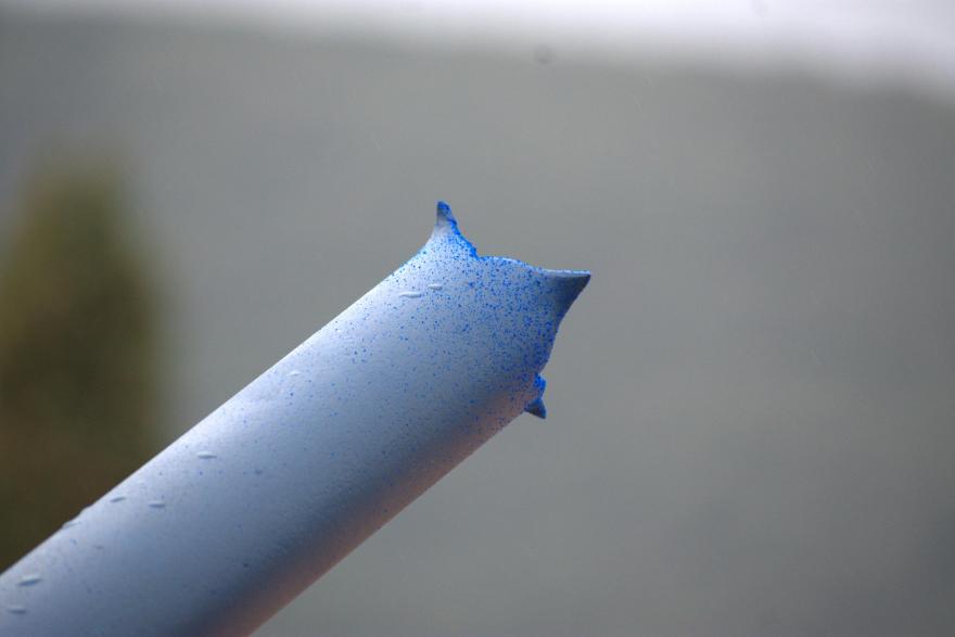 “Zaini per semi ribelli - Blu” (serie di installazioni cinetiche) 2025 Zaino, ferro, fumogeno, semi anemocori locali 160 x 100 x 40 cm Roccaforte di Narni (IT)