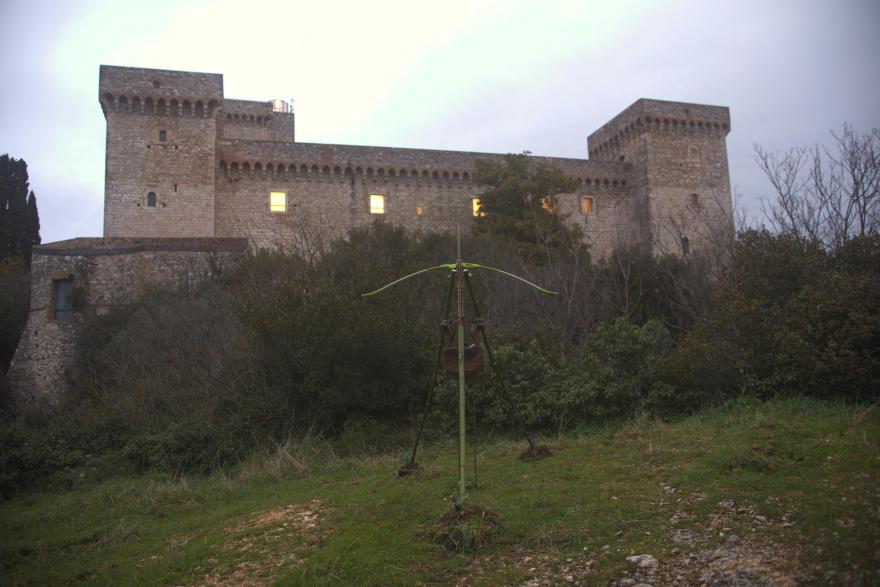 “Zaini per semi ribelli - Verde” (serie di installazioni cinetiche) 2025 Zaino, bamboo, ferro, vetro, sughero, semi zoocori locali 160 x 100 x 40 cm Roccaforte di Narni (IT)