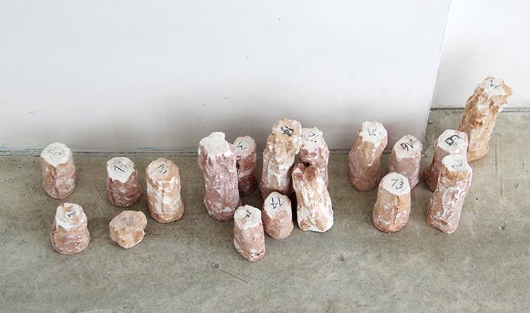 numerazione 2014. Installazione, 12 pezzi. Gesso, gomma lacca. Questi piccoli elementi di gesso nascono da calchi in silicone, da un gesto ripetitivo che non vuole ottenere copie identiche ma “altri corpi”. In questo modo si va a perdere la natura originale dell’oggetto calcato e si ricerca l’errore, la deformazione, includendo l’ipotesi della rottura. La numerazione, alle volte evidente, alle volte sbiadita esplica un processo mentale, riporta ad una dimensione di ordine meditativa e di riflessione.