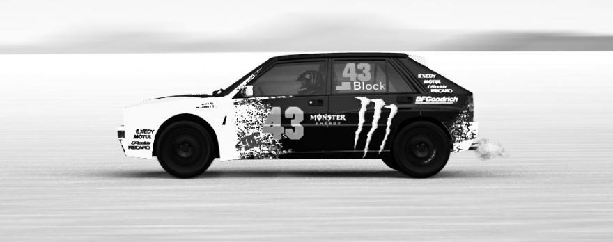 Una Lancia Delta Evoluzione con gli ormai famosi colori di Ken Block. Render 3d e post produzione.