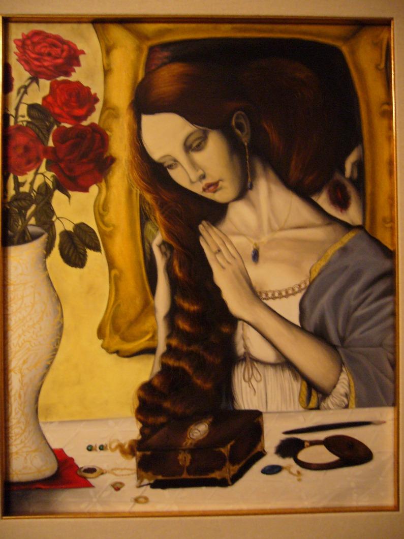 La donna rappresentata è intenta nella cura del proprio aspetto, come si arguisce dai gioielli, dagli utensili da trucco sparsi sul tavolo e dallo specchio, che con la sua strana posizione limita il mondo a ciò che circonda costei, quasi forzandola in tale angusta e dorata prigione.
