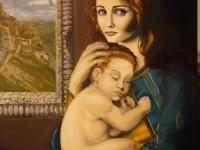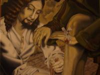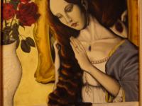 Lo specchio, notorio rivelatore, mostra il momento della consapevolezza della vistosa e letale Malattia, simboleggiata, in modo violentemente diretto, da una piaga sanguinante e infetta, a cui si accosta la mano cauta della stessa donna, a mostrare discretamente un atto tremendo che tormenta dal passato o lorda il futuro. L’ovvietà dei gesti non suggerisce la verità, come a lasciare che una sottile inquietudine incrini una così banale abitudine