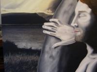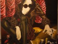 Le mani giunte sono solo l’ombra di un gesto di devozione, ambiguamente asservito alla cura dell’estetica della chioma ancora lievemente scomposta, lo sguardo è pensoso, opaco, ma non si limita al breve orizzonte antistante.