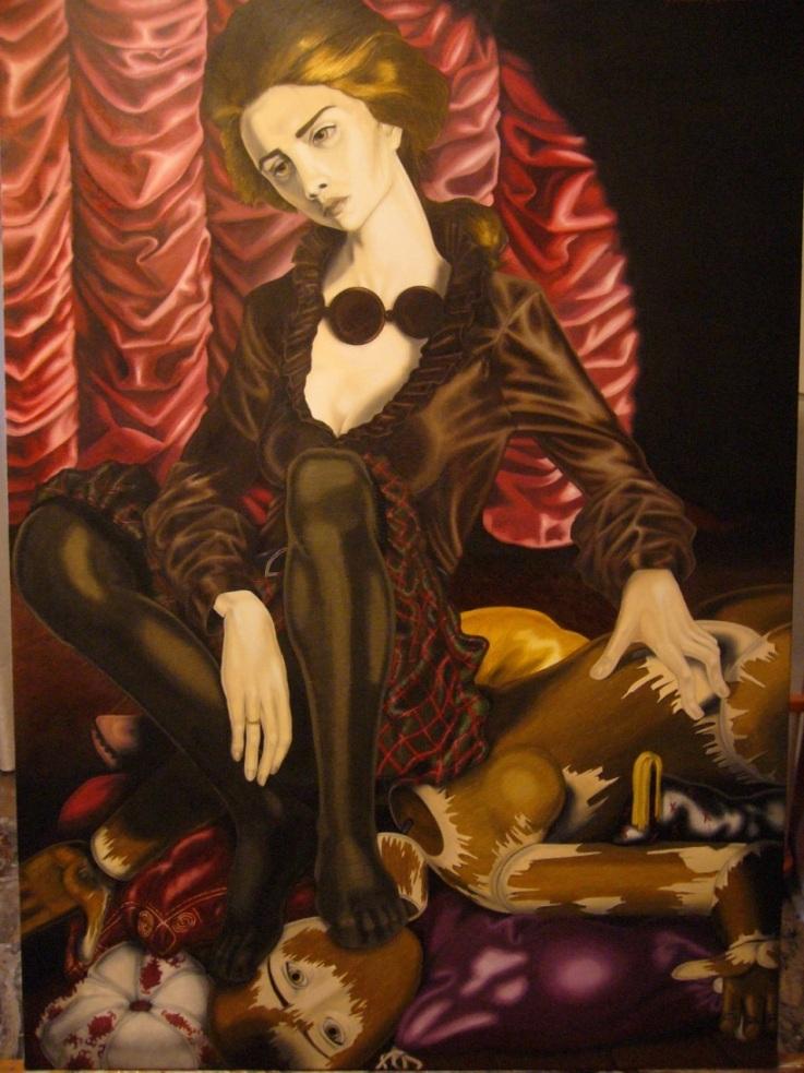 La mano destra porta la Fede, richiamo discreto al titolo, ma soprattutto si atteggia come una bianca bandiera ammainata, floscia sotto la sconfitta di una generazione orbata di qualsivoglia valore. La mano sinistra fa da appoggio alla figura intera, che è in precario equilibrio sulla propria “identità”, ma si appoggia proprio sul bassoventre del manichino, a sottolineare come le nuove fondamenta poggino soltanto sui bassi istinti umani. I Piedi schiacciano il capo della marionetta fino a disarticolarlo dal collo, insultano e disprezzano tutte le più alte funzioni che ci rendono umani: la sapienza, il raziocinio, la scelta, eccetera. La marionetta è l’Io della modella, è prona, con le braccia aperte, completamente arresa e arrendevole, solo negli occhi, fisicamente gli stessi della donna, si colgono sconvolgenti tormenti interiori, una disperata richiesta d’aiuto allo spettatore, paura. Le mani del manichino sono tagliate parzialmente dalla scena, ricordando come sia precluso l’agire a questa identità prigioniera. La vernice scrostata simboleggia, invertendone la collocazione in superficie, i brandelli dell’essere, usurato, in disfacimento. Il palcoscenico è l’apparire, il grande teatro della finzione, a cui si accosta la mollezza, la decadenza, la quale traspare in ogni rifinito particolare, nella ricercatezza volutamente esasperata, dai cuscini ai vestiti. In definitiva il quadro è uno spietato ritratto di una nuova Umanità, senza speranza, sconfitta, senza futuro, senza riscatto, La Sposa del Mondo (Titolo venutomi in sogno…) è una figura “Mitica” che subisce in sé tutto il male del mondo, appunto, come una vittima sacrificale esposta alle intemperie. La scelta della modella è stata dettata dalla sua stessa funzione di “esempio”, lavoro ingrato che sembra deprivarle dello spessore, della pienezza scultorea di una personalità completa.