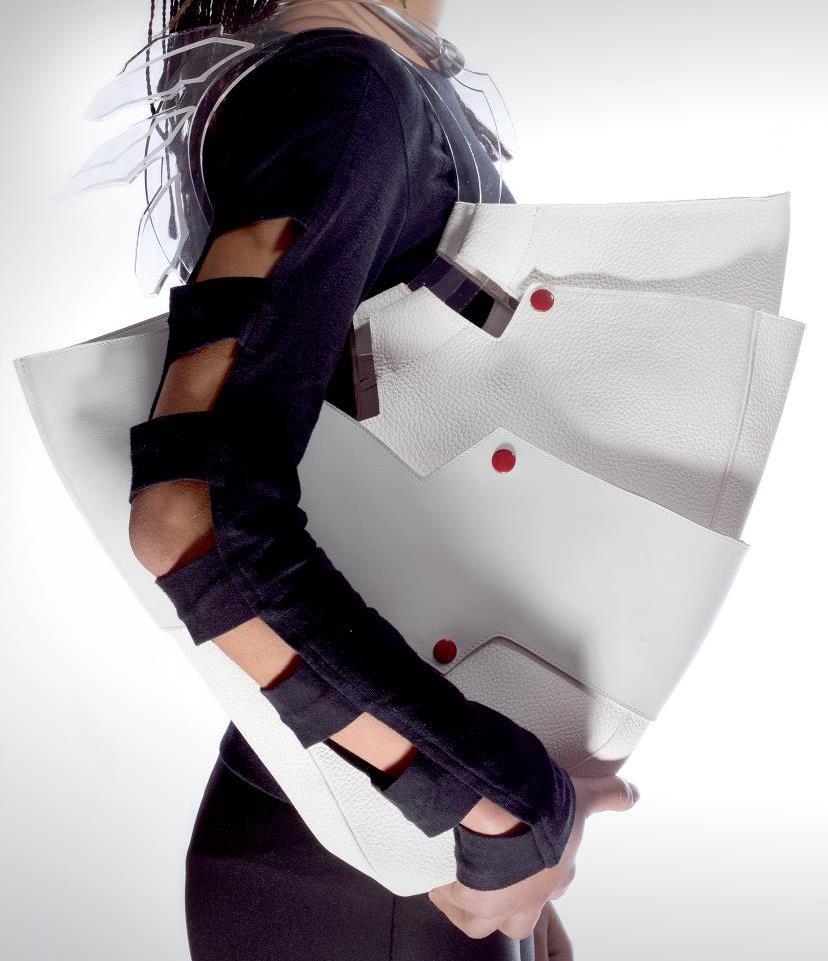 Borsa grande in pelle- vitello liscio e martellato. Manico in plexiglass. Tecnica mista: lavorazione artigianale della pelle e taglio laser. Altezza 53 cm Larghezza 44 cm. Serie limitata.