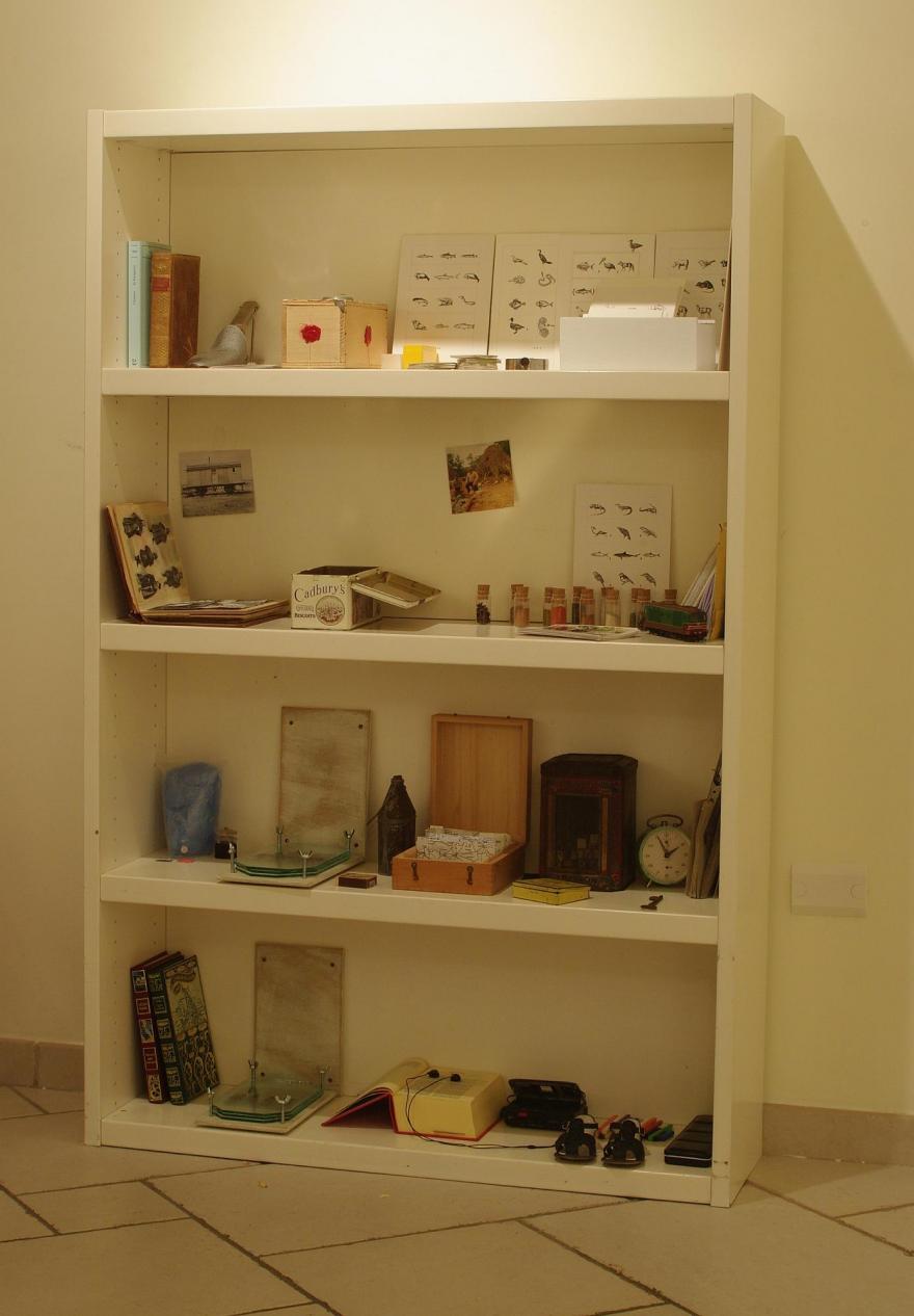 E' un'opera nella creazione della quale sono state chiamate a partecipare 20 persone. Partendo dal libro di Chatwin "in Patagonia", che inizia col ritrovamento di un antico lacerto di pelle da parte dell'autore in una libreria in casa della nonna, ho utilizzato la mia libreria domestica come un archivio di oggetti da viaggio. Sono nati così dalla collaborazione tra me e dei "non addetti ai lavori" dei piccoli lavori a 4 mani sul tema del viaggio e della memoria. Questi hanno occupato la libreria creando un archivio di memorie, che potesse condurre e spingere verso nuovi itinerari.