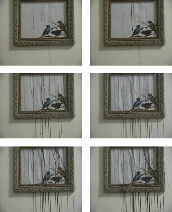 In Cage des larmes gli uccelli sono presentati come il contenuto di qualcosa che si va formando lentamente: i rigoli d’acqua disegnano una rete che imbriglia l’immobilità di un elemento finalmente presente e stabile, mentre continua comunque a contraddire la funzionalità di una prigione restituita in forme liquide.