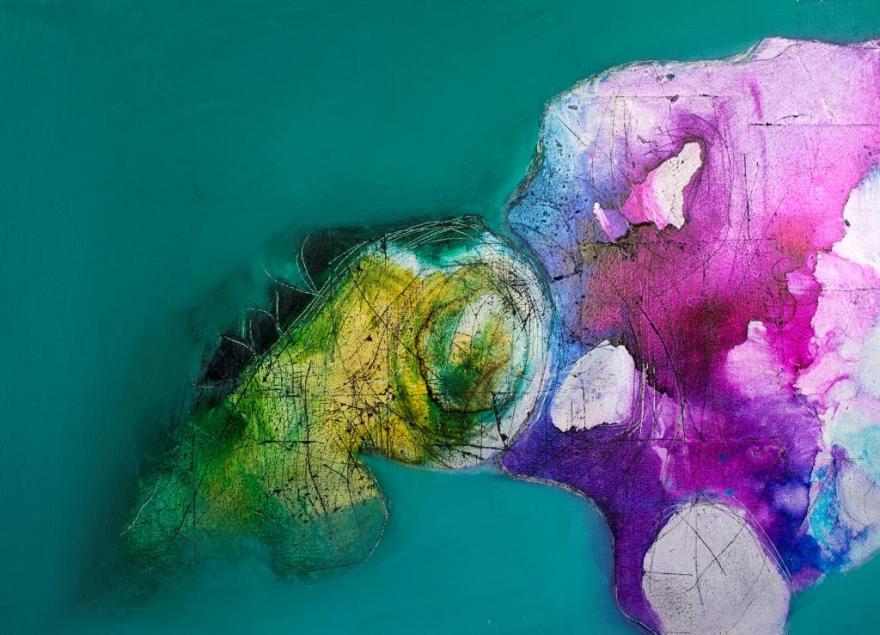 titolo SENSAZIONE tecnica COLORI A VETRO E OLIO LAMINA ARGENTO SU TELA dimensione 50x 70 anno 2013 autore FEDERICO BARATTA