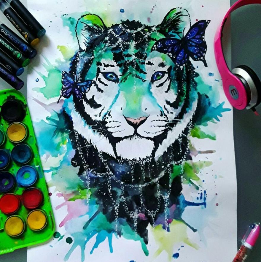 Disegno di una tigre realizzato con acquerello e markers (Chameleon)