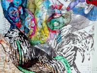 Il mio lavoro è una risposta alla realtà del quotidiano caos che genera il mondo. Ogni giorno attraverso i media assorbo una consistente dose di notizie, che mi provocano varie spaccature d'animo e flussi di coscienza. In un solo giorno si resta passivi alla morte, al sesso, alla politica e alla violenza. Questo destruttura i miei soggetti, li spezza, collocandoli in un lago di pensieri che non hanno ordine, dove io ho il compito di trovare un equilibrio. Tramite il colore ad olio riesco ad ottenere quella corposità che rispecchia il peso della frattura che porto dentro, e al contempo usando le ecoline riesco a comunicare la leggerezza della trasformazione, della metamorfosi. Nei miei lavori è insita una ricerca spasmodica di stabilità. Perché oggi tutto cerca un equilibrio, che sia mentale, fisico o meccanico. In fine sento che il mio lavoro è pronto quando tutti i pesi dei colori formano un'armonia, come una formula chimica, ma cromatica.
