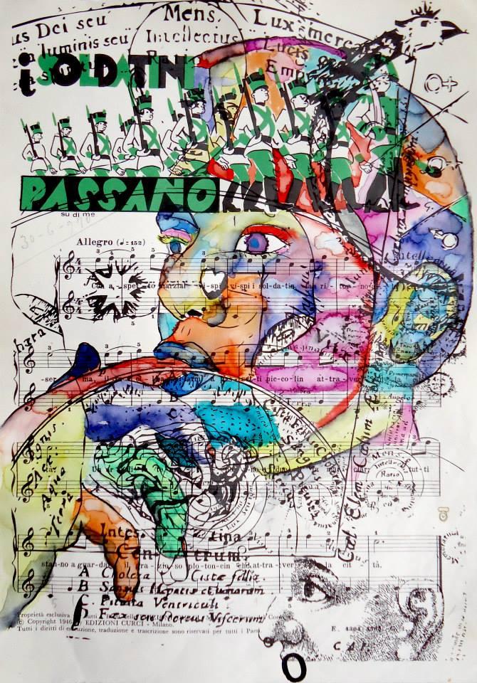 Self-portrait as darkness falls - ecoline on musical score - 31 x 23 cm