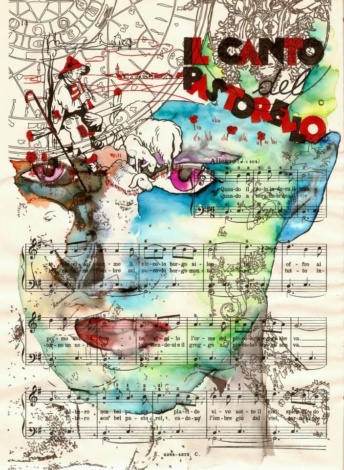 Self-portrait as darkness falls - ecoline on musical score - 31 x 23 cm