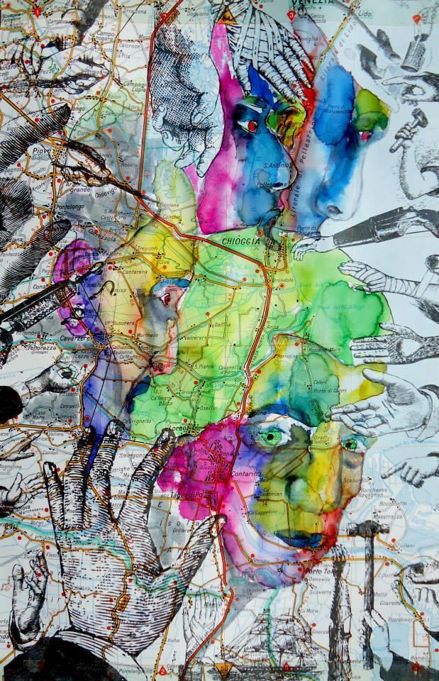 Through the lands - ecoline, highlighter and ink on road map - 32 x 22 cm