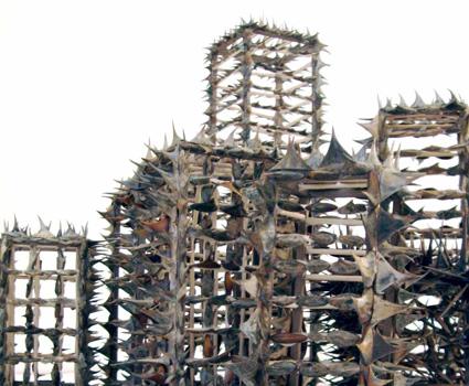 In details, Thorn City exemplifies repulsion for strangers, distrust, fear, but also the great loneliness connected to voluntary life-in-cage. The feather one, instead, Illustrates a nest town, comfortable, pleasant, but also out of touch with real world. The gall one shows assimilation in spite of prejudices; the one with empty chrysalises ( butterfly exuviae) mirrors a metamorphic town full of not jet expressed resources. The one made with wasps' nests displays an aggressive society obsessed by its children; the pod one, instead, a rich, flourishing, prosperous city.