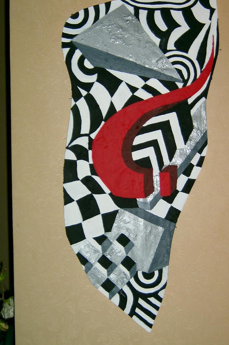 Realizzato con colori acrilici su tela autocostruita è caratterizzato da forme che si intrecciano tra di loro sormontati da questa forma indefinita di colore rosso che va in contrasto con tutto il resto del quadro, quasi come volesse mettersi in mostra.