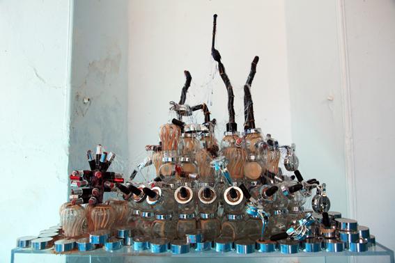 Medium: Honey jars, cosmetic containers, lipsticks, glue, mirror