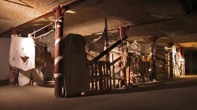 Medium: Door, chairs, tables, pallets, wood, fabric, glass bottles.