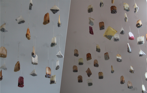sacchetti di tè usati, perle cucite.