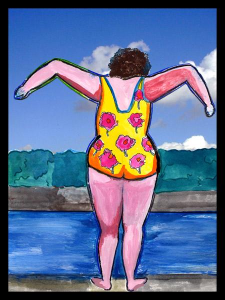 Tecnica mista acquarello, china, pennarello e coline. La tuffatrice nasce per divertimento dello spettatore che attende il balzo e sa che anche lei è lì per divertirsi.