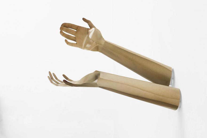 Frammenti di corpi, arti che sbucano dalle pareti e mani in attesa di un gesto di affetto o di un contatto occupano fisicamente ed emotivamente lo spazio nel progetto espositivo di Leo Gilardi.