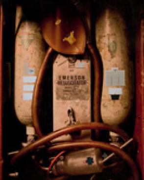 Al posto dell’Alice di Carroll, che s’inoltra attraverso lo specchio in un mondo visionario dove tutto può accadere, qui alcuni piccoli e dinamici hrobot (come l’autore stesso definisce i suoi protagonisti) superano le porte affacciate sul nostro passato industriale per rianimarlo con nuovi accadimenti solo in apparenza bislacchi. Un po’ simili a divertenti pupazzi alla Depero, un po’ figurine grafiche da fumetto, un po’ alter ego dell’autore (non a caso al posto degli occhi hanno le iniziali dell’artista, ovvero una “LR”), questi hrobot si avventurano in fabbriche abbandonate e corrose dal tempo, per rivitalizzarle, per aprirle a emozioni e avventure suggerite dal loro stesso passato industriale, evocate dalle forme e dalle atmosfere che l’autore ha colto con i suoi scatti fotografici. Irti ferri che penzolano inerti dalle travi di un soffitto vengono riattivati da un robot demiurgo con scosse e saette di corrente elettrica, mentre un altro se ne sta di spalle protetto da un improbabile ombrello (Electrolife). Una cupa e obsoleta macchina respiratrice “Emerson Resucitator” pare aver davvero risuscitato un hrobot che vola verso il cielo con tanto di aureola celeste (Aahff), mentre altri piccoli compari sembrano impegnatissimi a mettere in moto strani e obsoleti macchinari di cui solo loro paiono conoscere i segreti (Ironarmars).
