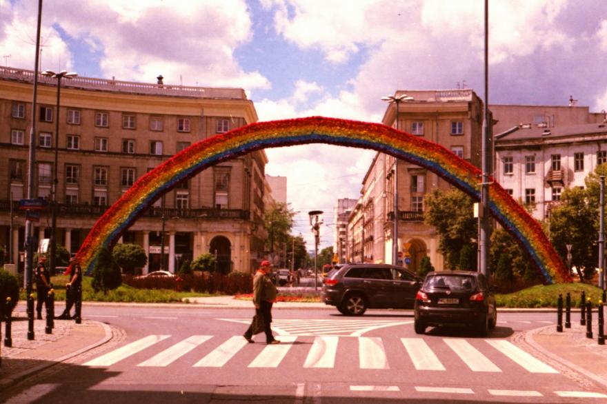 Tęcza e' una scultura progettata da Julita Wójcik. E' stata bruciata piu' e piu' volte da estremisti di destra e ultra-cattolici, innescando dibattito sui media e tra l'opinione pubblica. Nella foto, scattata l'estate del 2014, la polizia piantona la scultura, che verra' poi rimossa dopo l'ultimo cambio di governo, successivo alle elezioni che hanno visto vincere il partito "Diritto e Giustizia" una formazione populista destra.