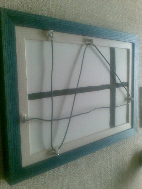 Questa creazione è ispirata alle opere di Gianni Colombo ed affida all’osservatore la completa libertà di elaborazione delle relazioni tra linea dipinta, filo agganciato alla cornice e l’utilizzo di materiale elettrico.