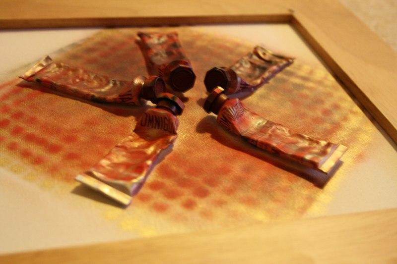 In questa opera l’oggetto Tubetto da sempre contenitore svuotato dal suo contenuto “il colore” diventa soggetto dell’opera ed alla fine la griglia di “Colore” diventa Contenitore del Tubetto. L’opera “Tubetti” riflette sulla relazione tra Contenitore e Contenuto che può invertirsi grazie all’opera artistica. Purtroppo questo gioco lo vedo applicato nel mondo della TV in cui “Cultura e Informazione” diventano solo il contenitore per un contenuto di “Spettacolo”.