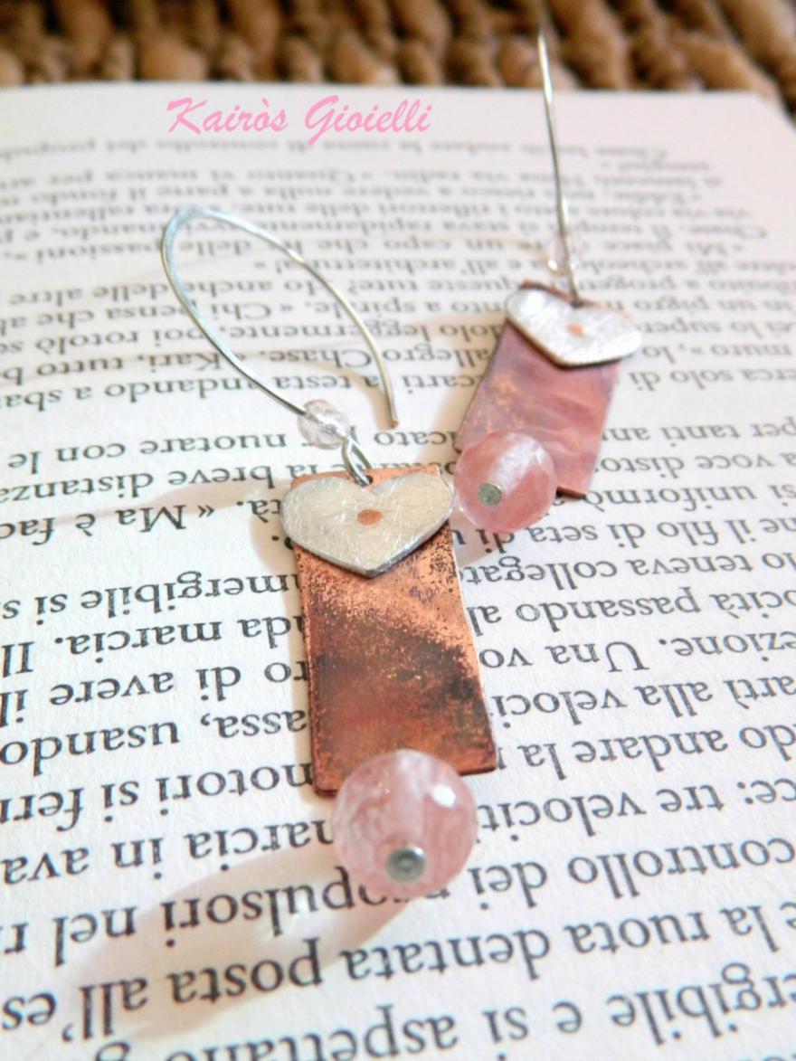 Orecchini realizzati interamente a mano in rame e alluminio. Il rettangolo in rame è stato lavorato fino a donargli sfumature particolari, leggermente diverse sui due pezzi, che tendono al rosa; su di essi sono stati rivetati due cuori in alluminio, lavorati e graffiati. Gli orecchini sono infine decorati con due pietre di Agata rosa chiaro; le monachelle sono in rame argentato (su richiesta possono essere sostituite da monachelle in argento 925), fatte a mano, decorate con un piccolo mezzo cristallo rosa. Sul retro, una piastrina incisa con le iniziale KG.