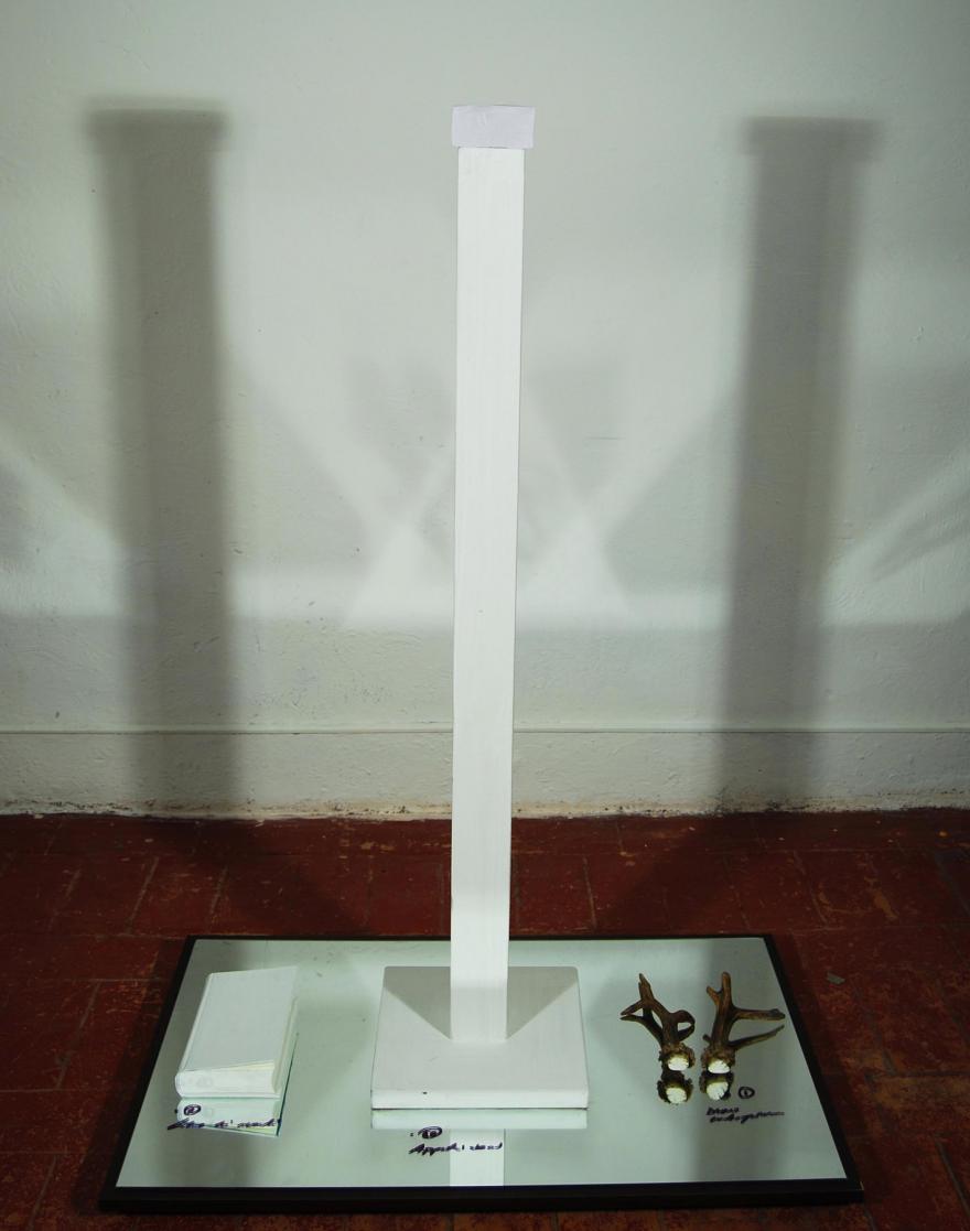 La scultura non intesa come realizzazione di un elaborato a tutto tondo ma di oggetti che prendono vita e vengono analizzati sopra un piano, una superficie, in questo caso riflettente.