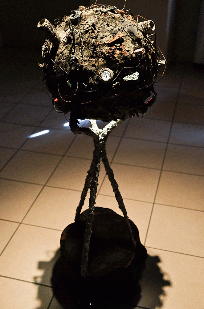 La Terra anch’essa martirizzata, intarsiata di elementi plastici e metallici con fori, che fungono da canali che arrivano al centro della terra stessa. Lì ci sono gli umani, rifugio di ricordi, aggrappati a speranze fragili di interiorità.